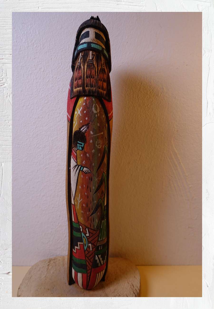 Indianische Kachina-Skulptur der Hopi, bezeichnet als "Long hair maiden" (das lange Haar ist rückseitig besser erkennbar), ein phallusförmiges Fruchtbarkeits-Symbol, handgeschnitzt und handbemalt, u.a. mit den Motiven: Indianer, Maispflanze, Regentropfen und