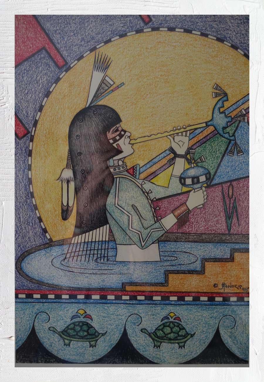 zwei Schildkröten zur Quelle und tragen das Symbol des Regens (farbige Wolken), auch die Farben der Schildkröten erinnern an Wasser: türkis, das Symbol der fließenden Spiritualität, sign., Format 40 x 56 cm (mit Rahmen). Die Zeremonie der Ureinwohner wird alle zwei Jahre stundenlang aufgeführt, dabei handelt es sich um ein Gebet, damit das Wasser wieder hervor sprudelt. Die Werke des Künstlers sind z.B. im Weelwright Museum of American Indian (Santa Fe, New Mexico) zu finden.