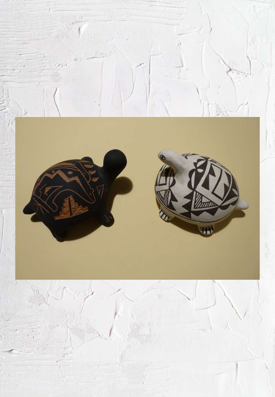 2 indianische Töpferarbeiten der Acoma, New Mexico. Links ist das Motiv eines stilisierten Bären eingeritzt und mit A.C. sign., das rechte Objekt ist mit geometrischem Design handbemalt und mit E.O. sign.