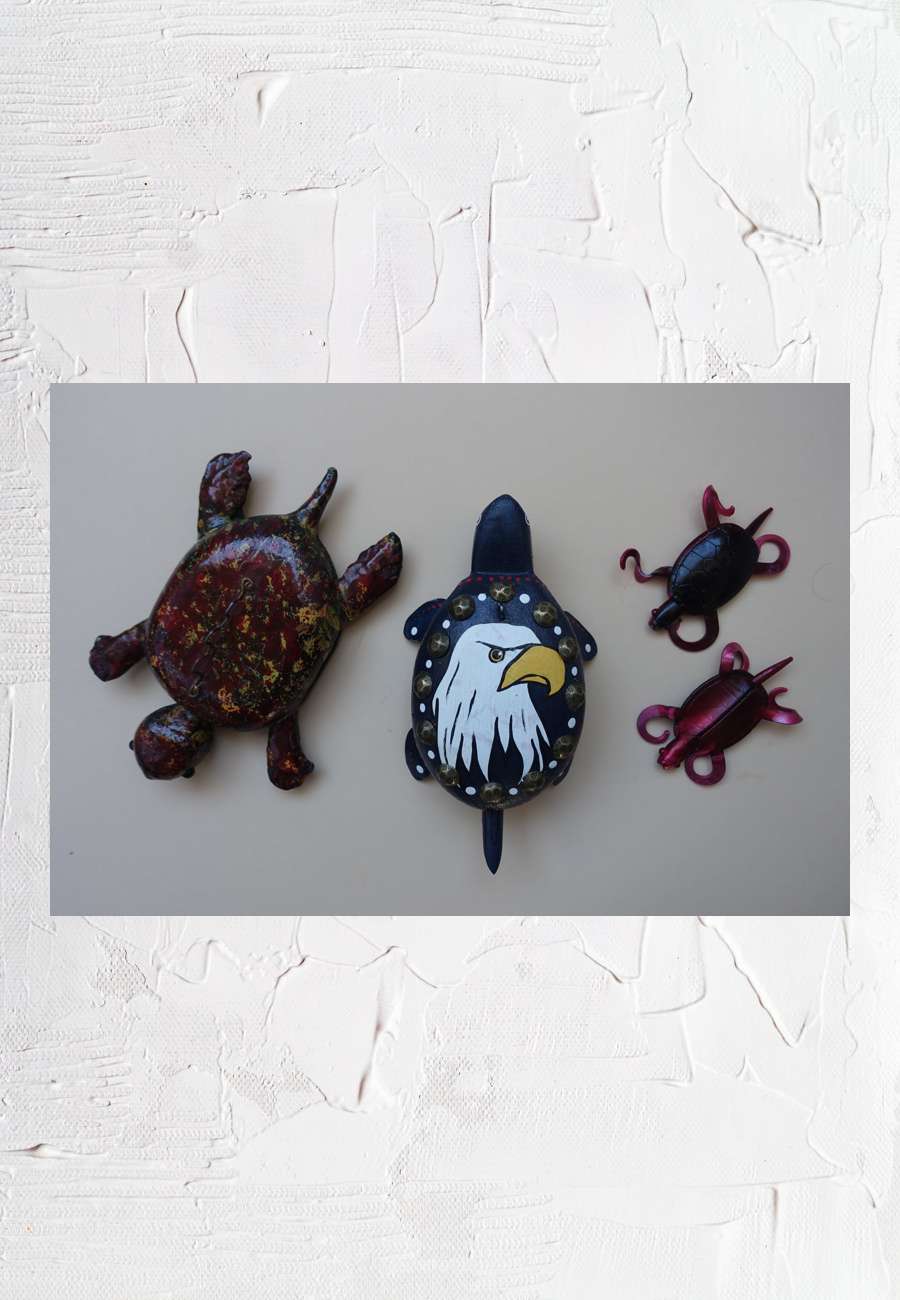 Zwei Köder (Marine turtle decoys) für das Eisfischen am Michigan-See, USA, geschnitzt und handbemalt (restauriert), mit Metallöse, Bleigewicht im Boden,