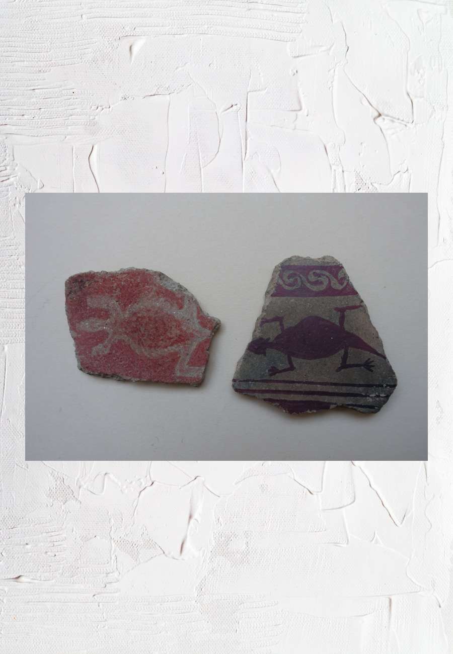 Ton-Scherben (Größe je ca. 6 cm) von Gefäßen der Hohokam-Kultur, eine präkolumbische indianische Kultur, die von 300 - 1.500 nach Chr. existierte, im Südwesten der heutigen USA (Arizona). Bei Ausgrabungen stieß man auf charakteristische Keramik-Funde (einen regelrechten "Scherben-Friedhof"). Das aufwändigste Kennzeichen der Kultur war ein ausgeklügeltes Bewässerungssystem. In der Mythologie der Ureinwohner Nordamerikas steht die Schildkröte für Mutter Erde.