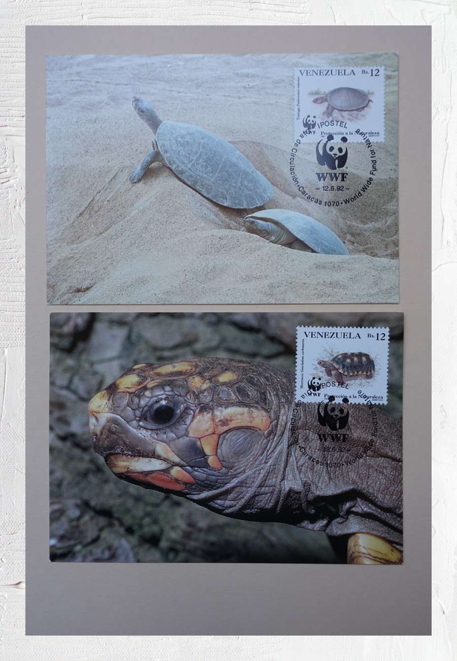 2 Postkarten mit Schildkrötenfotos und der jeweils artgerechten Sonderbriefmarke mit WWF-Ersttagsstempel.