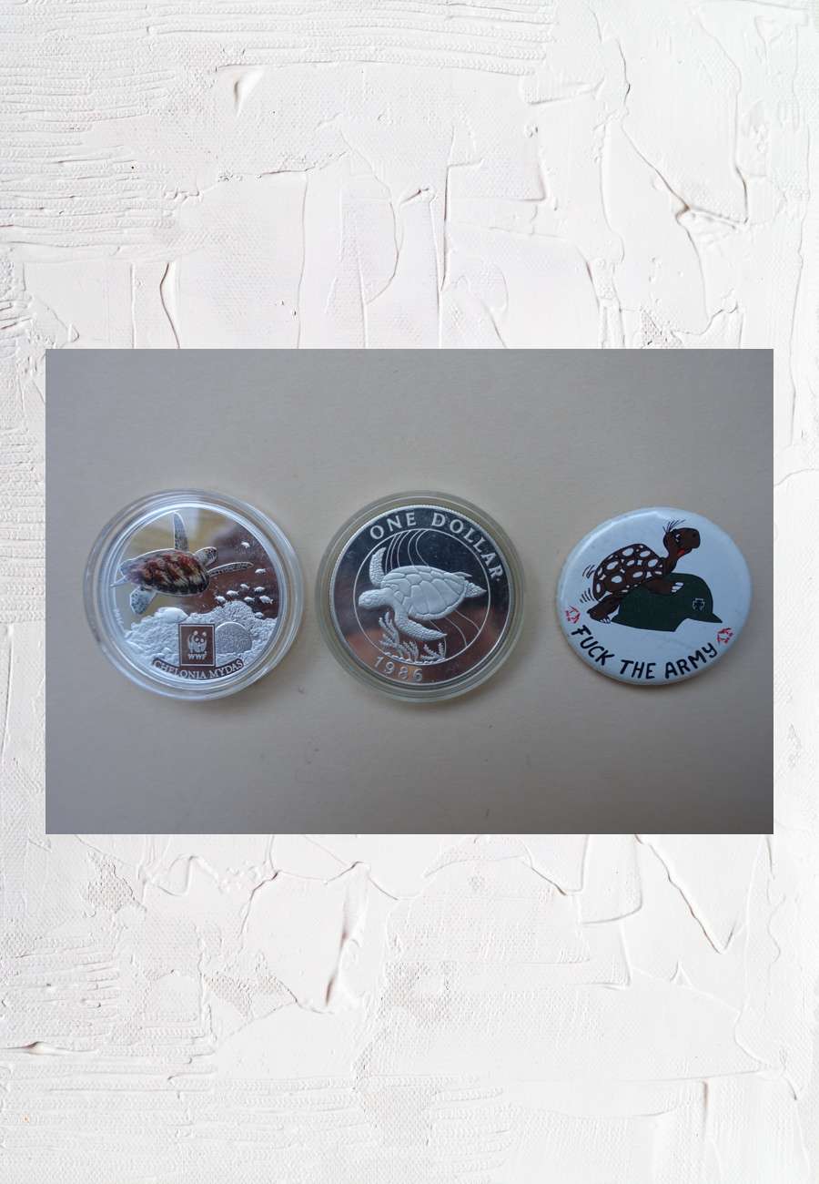 von links: Silbermünze mit farbig eingelegter Schildkröte (100 Shillings) aus Tansania; Silbermünze, Bermuda (rückseitig mit Porträt der Königin Elizabeth II) und