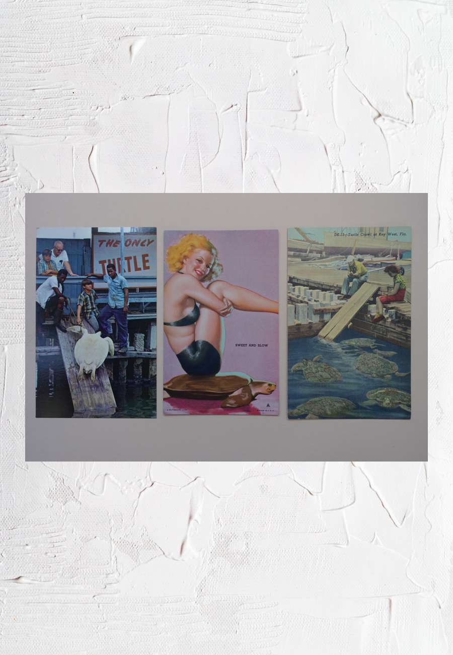 mittig: mutoscope card "Sweet and Slow" (colour lithograph 1943); rechts: "Turtle Crawl at Key West" (Florida 1940), rückseitige Information "Where turtles weighting hundreds of pounds are stored in