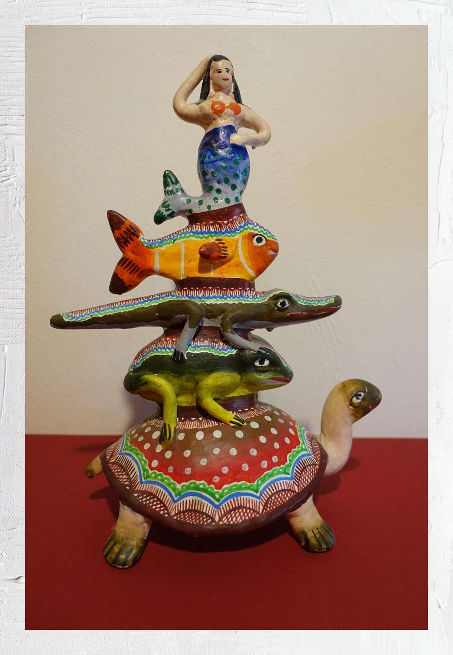 Sicher ungewollt türmen sich hier im Kontrast zu den "Bremer Stadtmusikanten" Schildkröte, Frosch, Krokodil, Fisch und eine Nixe. Handgetöpfert und farbenfroh bemalt, aus Mexiko, im Boden signiert, ca. 27 cm hoch. Es gibt noch eine bewußte Variante, s. Julia Tittmann.