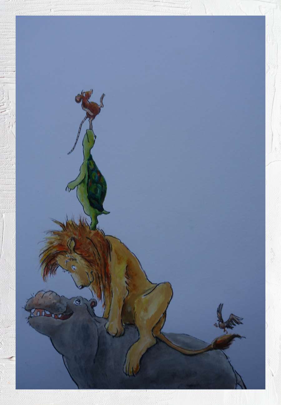 Mein Original dieser Tierpyramide, Aquarell und Tusche (Format 32 x 25 cm), wurde zur Titel-Seite von "Das große Vorlesebuch" für Großeltern, Enkel und andere Leute, Kaufmann-Verlag. Natürlich habe ich auch das Buch sowie weitere Arbeiten der Künstlerin. Sie ist Illustratorin zahlreicher Bücher, hat aber auch abstrakte Arbeiten geschaffen.