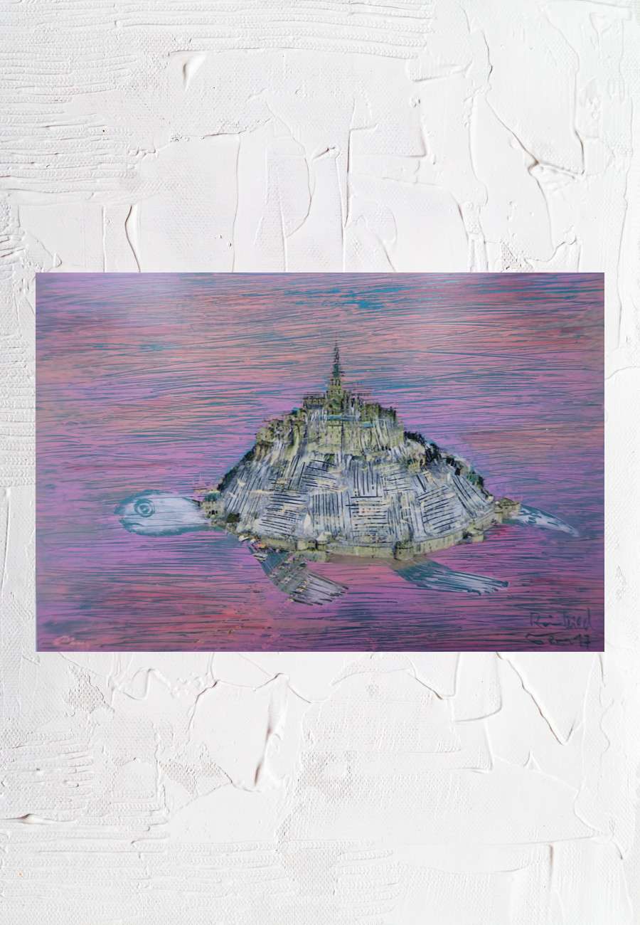 Postkarte (DIN A 6) von "Le Mont-Saint-Michel", mit Ölpastell übermalt. Das Motiv entsteht dann durch Auskratzung. Es ist eine Auftragsarbeit und somit ein