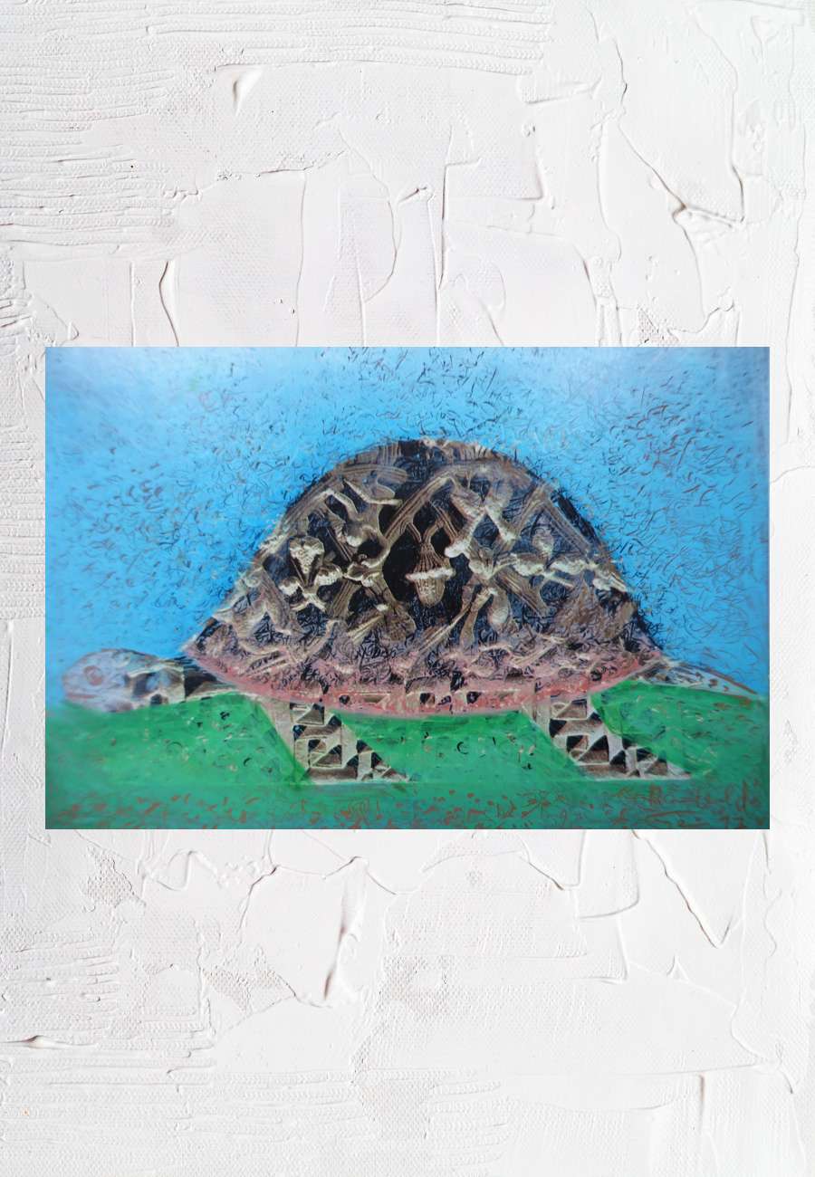Postkarte von Toulouse, Musee des Augustins, Kapitell aus dem 12. Jhd., mit Ölpastell übermalt. Das Motiv entsteht durch Auskratzung. Es ist eine Auftragsarbeit (Unikat).