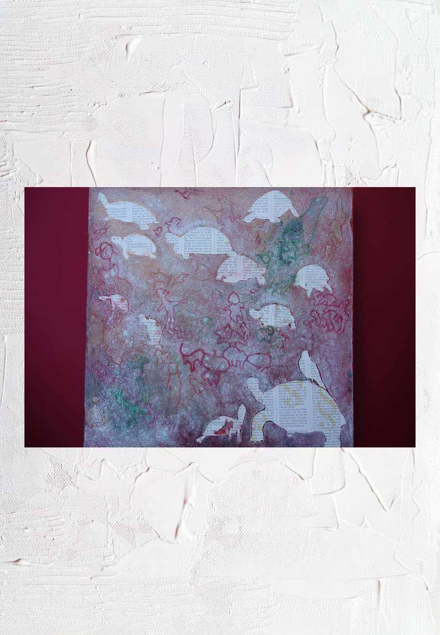 Auftragsarbeit, Collage auf übermalter Leinwand, Acryl, mit 11 Schildkröten-Varianten, ausgeschnitten aus einem Text zur Schildkröten-Haltung, Format: