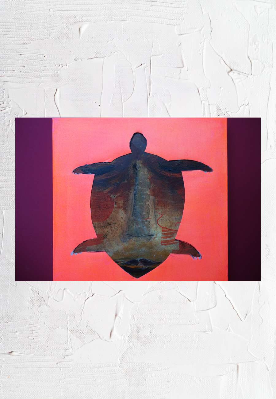 Naturfarben auf Leinwand (ausgeschnitten), die Schildkröte auf Karton ist hinterlegt, die Arbeit rückseitig auf einem stabilen Holzrahmen befestigt, Titel: "Das zweite Gesicht", Format 40 x 40 cm.