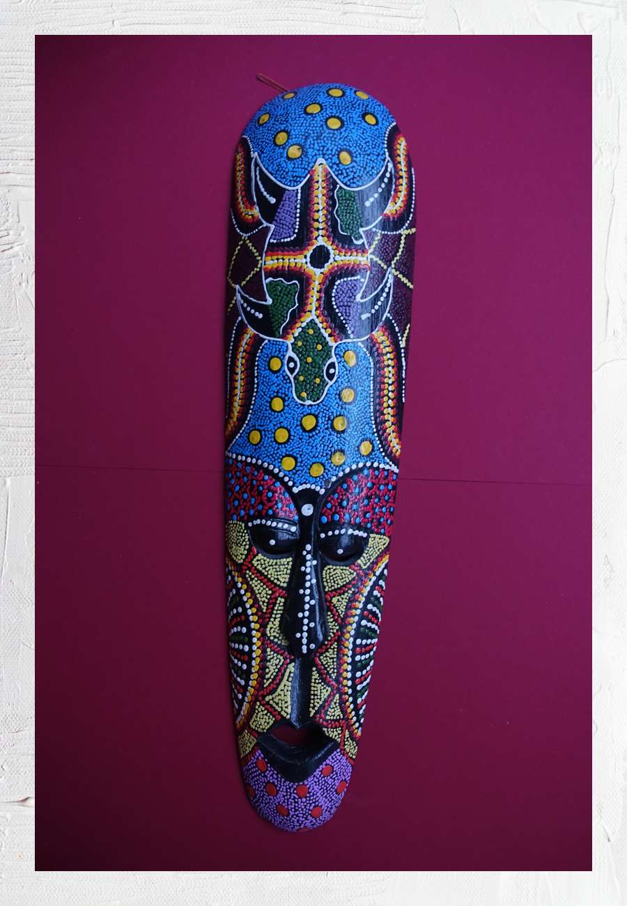 Brettmaske, aus schwarzem Holz geschnitzt und im Stil der Aborigines (Australien) mit Punkten bemalt, mit einer Meeresschildkröte und einer Maske, ca. 50 cm lang.