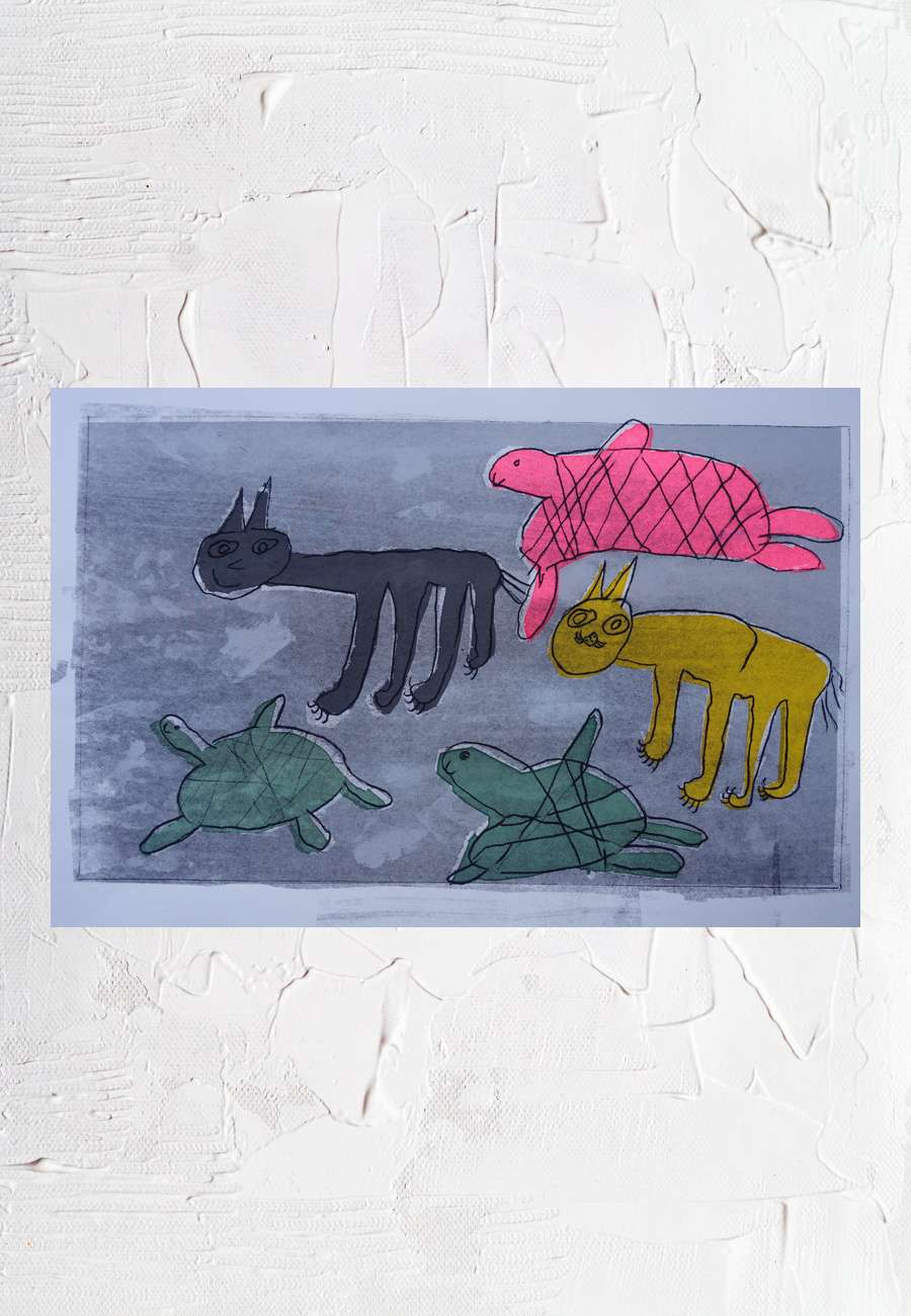 Siebdruck, Projekt Kinderzeichnungen, Handabzug, Format 43 x 30 cm. Edition im Wasserturm, Berlin.