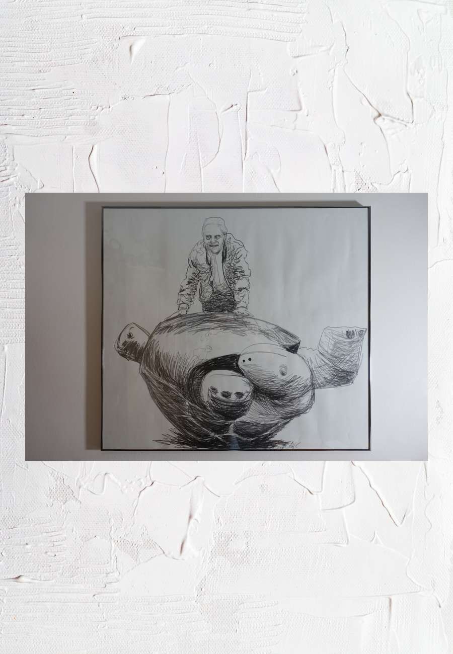 Auftragsarbeit, Zeichnung, Kohle und Graphit, sign., Format 89 x 98 cm. Wegen der überraschenden Größe des Bildes, die vorher nicht abgesprochen war, suchten wir gemeinsam nach der besten Aufhängungsmöglichkeit im Wohnbereich. Der Künstler hat Bildhauerei (Prof. Paolozzi) und Malerei (Prof. Baschang) in München studiert und ist Mitglied der Münchener Secession. Er malt figürlich (auch Portraits), teils in expressivem Stil und pflegt dabei seine Freiheit. Das Motiv der hilflos auf dem Rückenpanzer liegende Schildkröte orientiert sich an der Arbeit