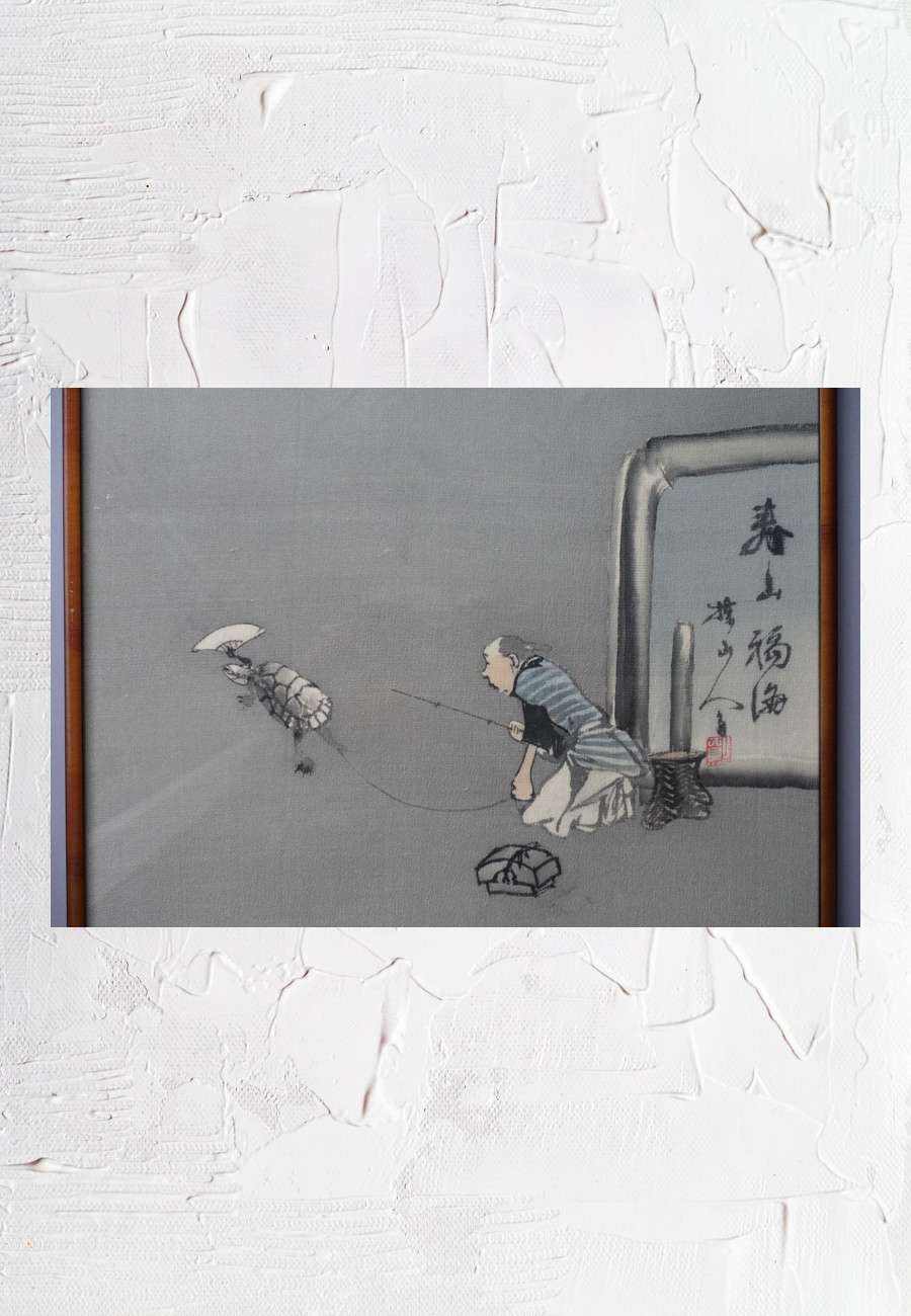 Tusche und Aquarell (Gouache), auf Kreppseide, japanischer Künstler, um 1920, Format 40 x 45 cm. Das Motiv läßt sich einer