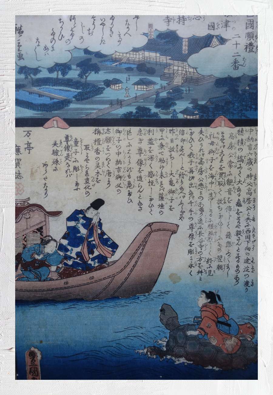 Farb-Holzschnitt zu einem der ältesten Märchen aus Japan, versehen mit einem Text zu der Legende des jungen Fischers Urashima Taro, sign., gerahmt, Format 36 x 49 cm. Der Meister des
