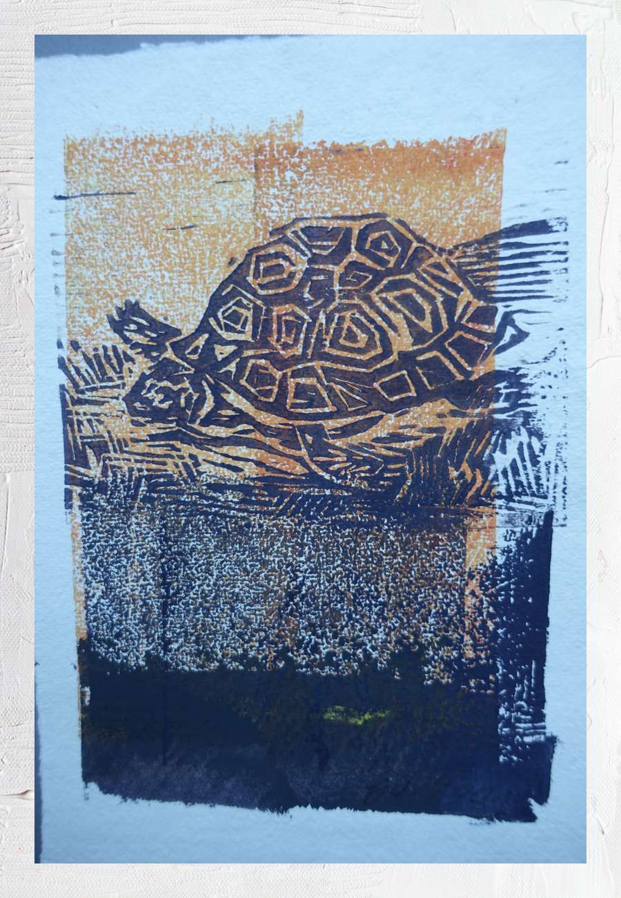 Holzschnitt von 2001, sign., 15 x 21 cm. Zusätzlich gibt es eine Variante des Motivs im Querformat, violett aquarelliert und eine Reihe weiterer Arbeiten (z.B. zu einem Gedicht von Rilke), aber ohne Bezug zum Thema Schildkröte.