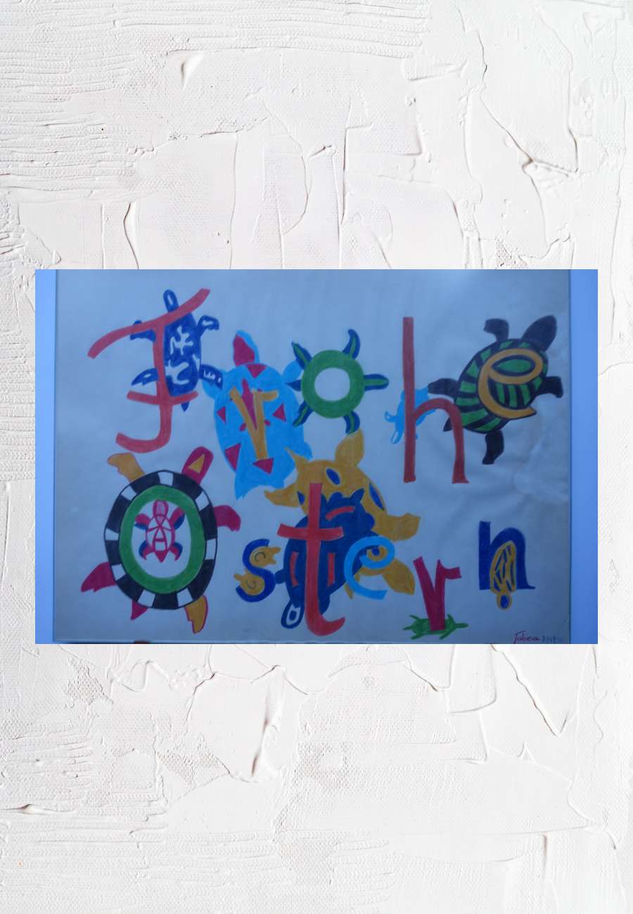 In diesem Bild der 17-jährigen Schülerin sind nicht weniger als 13 "Schildkröten-Ostereier" versteckt. Gemalt mit Farbstiften, Format 40 x 30 cm.