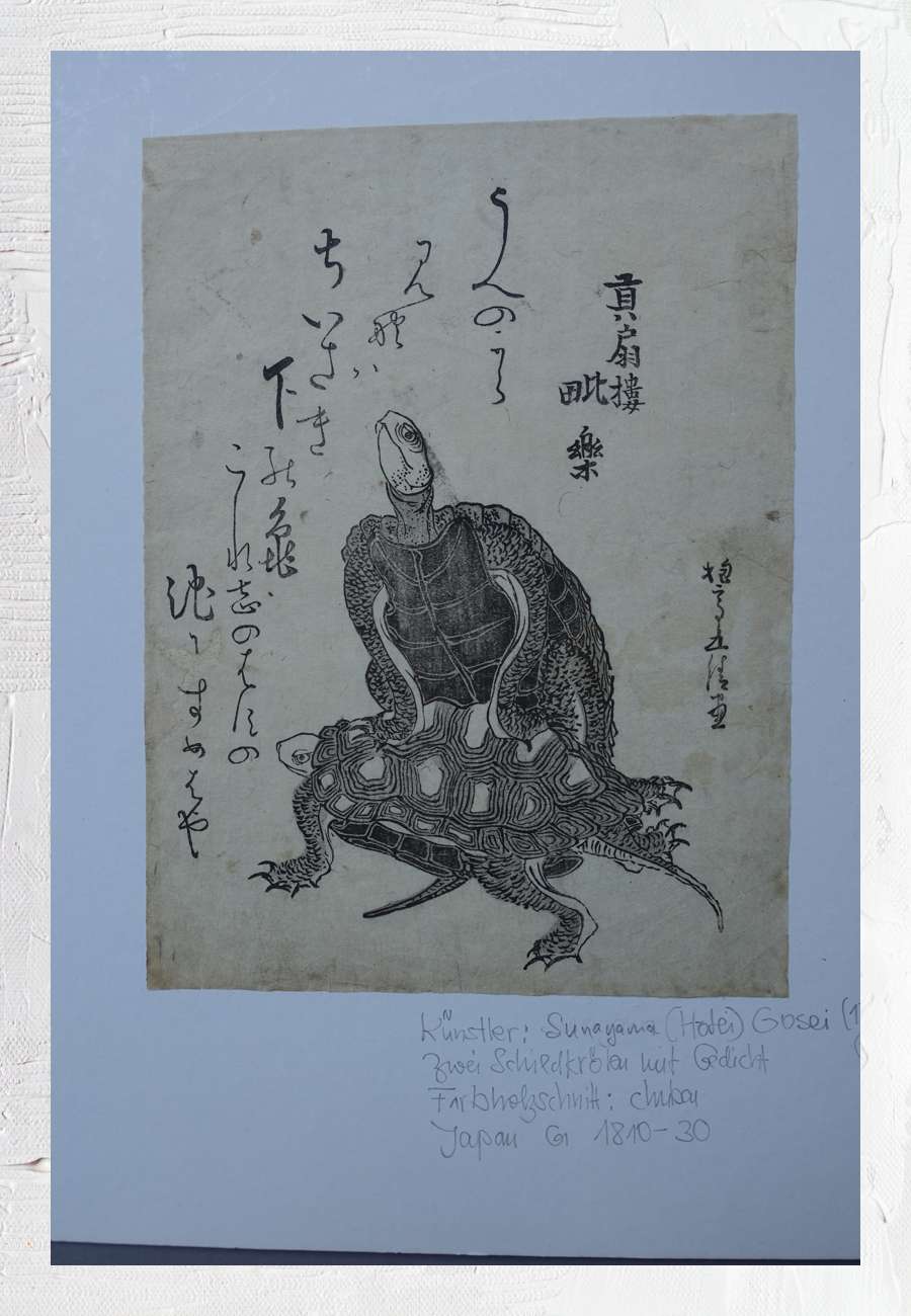 Surimono, Japanischer Holzschnitt von ca. 1820, Format mit Passepartout 28 x 36 cm. Das dazugehörige Gedicht stammt vermutlich von Jingairo Kiyozumi und