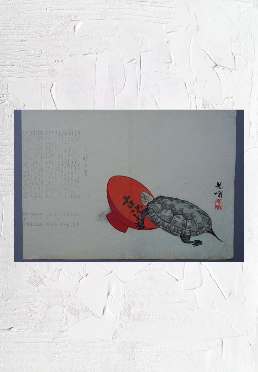 Surimono ( deutsch "Drucksache") ist eine besondere Form des japanischen Farbholzschnitts. Originell ist das Motiv der Schildkröte mit einer Sakeschale, aus der Reiswein getrunken wurde. Das Bild von 1892 zeigt einen Ausschnitt, der Text ist nämlich noch wesentlich länger, Format 20 x 56 cm. Der Begriff bezeichnet Grüße von Einzelpersonen, Dichtervereinigungen (oft mit Gedichten), aber auch Unternehmen,