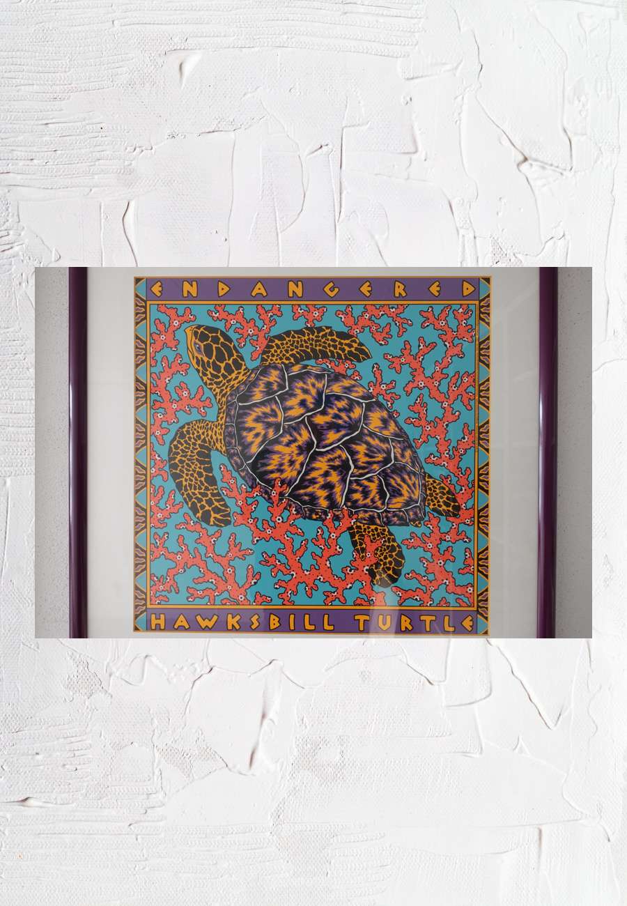 Hochwertige Druckgrafik, in schmalem, violetten Rahmen, repräsentatives Format 87 x 83 cm. Die Inschrift weist darauf hin, dass diese Schildkrötenart (Echte Karettschildkröte) trotz des Internationalen