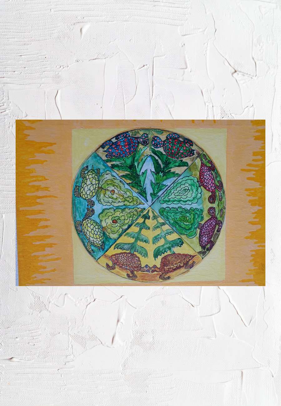Acryl, sign., Format 30 x 40 cm. Die Schildkröten-Paare tragen jeweils einen Baum auf ihrem Rücken.