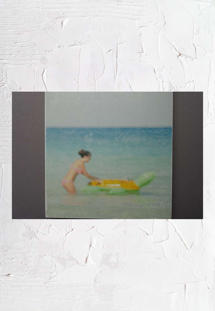 Multimedia, Foto (schon unscharf aufgenommen), Übermalung und Polyvenylschicht verschmelzen zu einer Art Patina, auf Birkenplatte, Titel "The girl turns turtle", Unikat in Serie 3/12, Künstlername SPOXO,