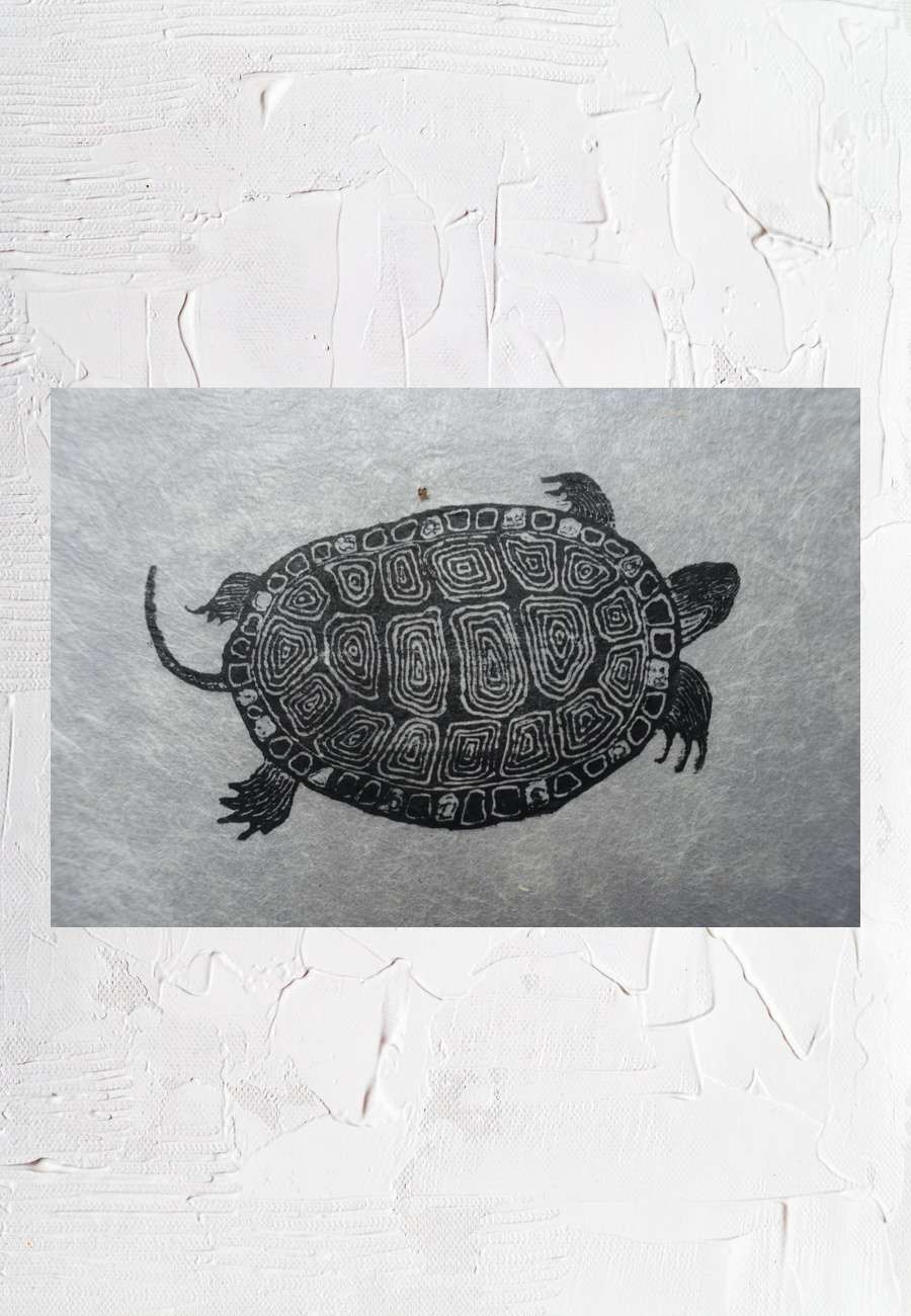 Zeitgenössischer Holzschnitt auf hauchdünnem Washi-Papier, Titel "midori game" (Buchstaben-Schmuckschildkröte), num. 2/15, auf meine Nachfrage über die Micheko Galerie München beschafft (ausgestellt waren 160 seiner Holzschnitte, jedoch keine Schildkröte), sign., Format 24 x 19 cm.