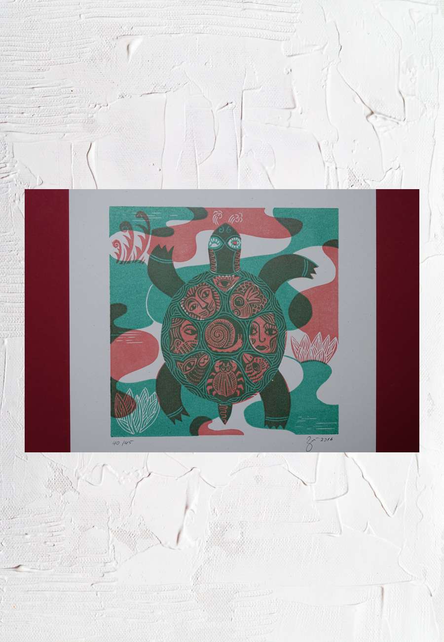 Linolschnitt, numeriert 40/45, sign., Format 28 x 33 cm. Die diplomierte Grafik-Designerin und Buchbinderin hat ihre eigene Werkstatt in der ehemaligen Leipziger Baumwollspinnerei, jetzt ein Kreativ-hot-spot.