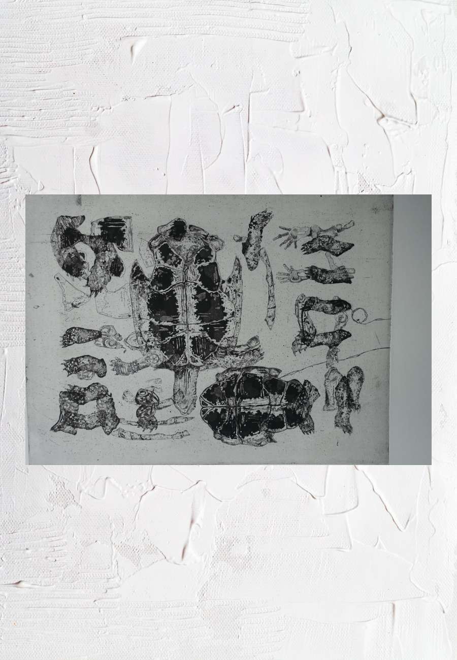 Radierung (Strichätzung, Aquatinta, Kaltnadel), Titel "Bruchstücke", num. 3/10, Format 38 x 48 cm. Die approbierte Apothekerin studierte an der Kunstakademie Stuttgart (Prof. Volker Lehnert, s. auch Katalog) und arbeitet seit 2012 freischaffend. Der Kontakt ergab sich über den "Verein für Originalradierung" (München).