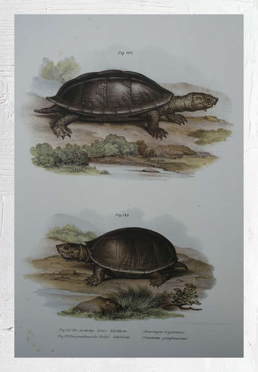 Farblithographie, ca. 1870, Format 27 x 35 cm. Abgebildet sind die dreikielige Kreuz-Schildkröte und die pensilvanische Deckel-Schildkröte.