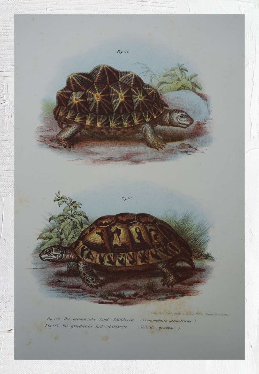 Farblithographie, ca. 1870, Format 27 x 35 cm. Zu sehen sind die geometrische Sand-Schildkröte und die griechische Erd-Schildkröte. Die Schildkröte oben weist ein besonders schönes Muster auf und wird heute als Indische Sternschildkröte bezeichnet.