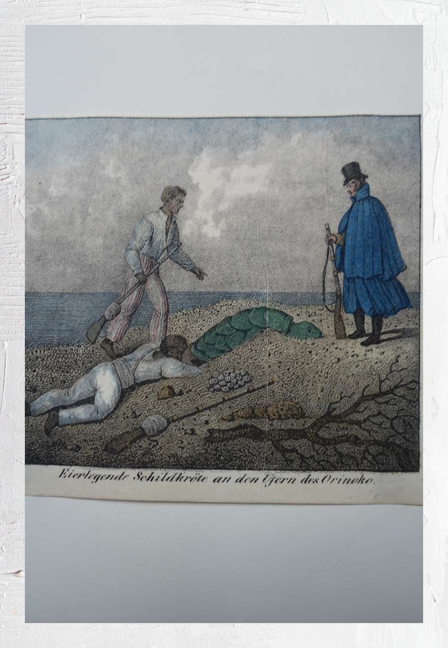 Lithografie, altcoloriert, von 1840, Titel "Eierlegende Schildkröte an den Ufern des Orinoko" (Venezuela), Format 16 x 21 cm. Das Blatt stammt aus
