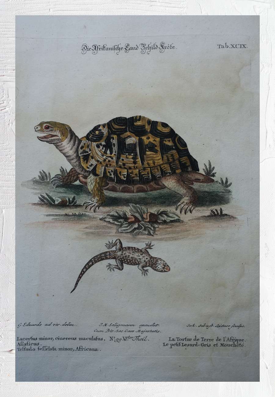 Altcolorierter Kupferstich, ca. 1770, von J.S. Leitner, Nürnberg, Titel "Die Afrikanische Land Schild-Kröte", Format 24 x 39 cm. Verleger J.M. Seligmann