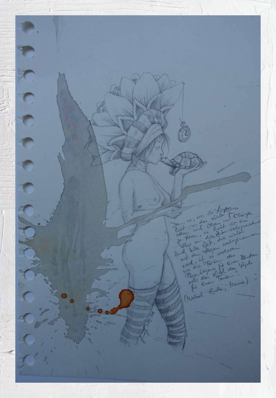 Auftragsarbeit, Zeichnung, Bleistift und Aquarell (Unikat), mit handschriftlichem Textausschnitt aus Michael Ende`s "MOMO". Format 14,5 x 21 cm.