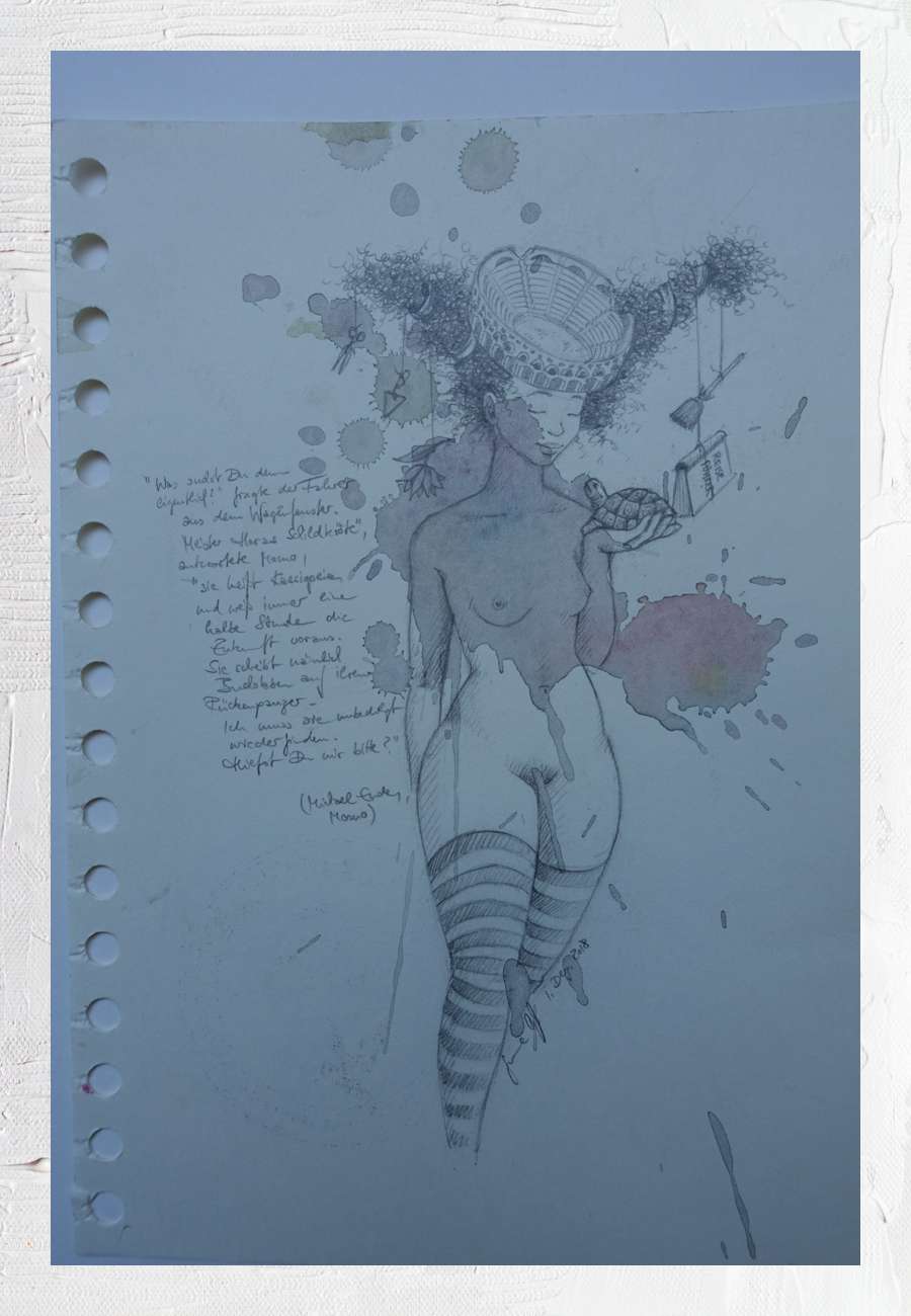 Auftragsarbeit, Zeichnung, Bleistift und Aquarell, mit Text aus Michael Ende`s "MOMO", Unikat, rückseitig sign., Format 14,5 x 21 cm. Symbole sind hier