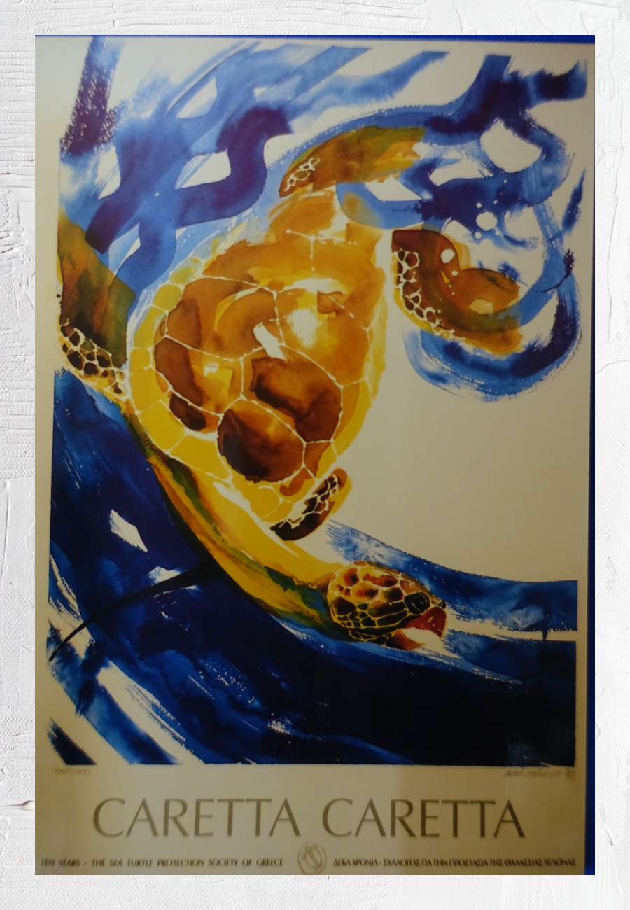 Plakat, handsign., Format 70 x 50 cm, numeriert 859/1000, Vorlage ist ein Aquarell des Künstlers. Anlass war das 10-jährige Bestehen der "Sea Turtle Protection Society of Greece", 1996 erworben auf Zakynthos (Griechenland). Dort hatte ich das Glück, an einem geschützten Strand den Schlupf von Meeresschildkröten (Caretta Caretta) zu beobachten und bin seither durchgängig für den Schutz vieler Schildkrötenarten engagiert. Die Insel gilt als eines der wichtigsten Nistgebiete im gesamten Mittelmeerraum. Seit ca. 1999 hat sich die Aktionsgemeinschaft Artenschutz (AGA) mit ihren Partnern von MEDASSET (Mediterranean Association to Safe the Sea Turtles) dafür eingesetzt, dass dort ein Meeresnationalpark entstanden ist. Beide Institutionen sind bis heute auf Zakynthos aktiv. Um so mehr freut mich, dass laut AGA 2024 ein Rekord von ca. 2.400 Nestern an den dortigen Stränden dokumentiert wurde. Dies zeigt, was man mit entsprechendem Einsatz erreichen kann.