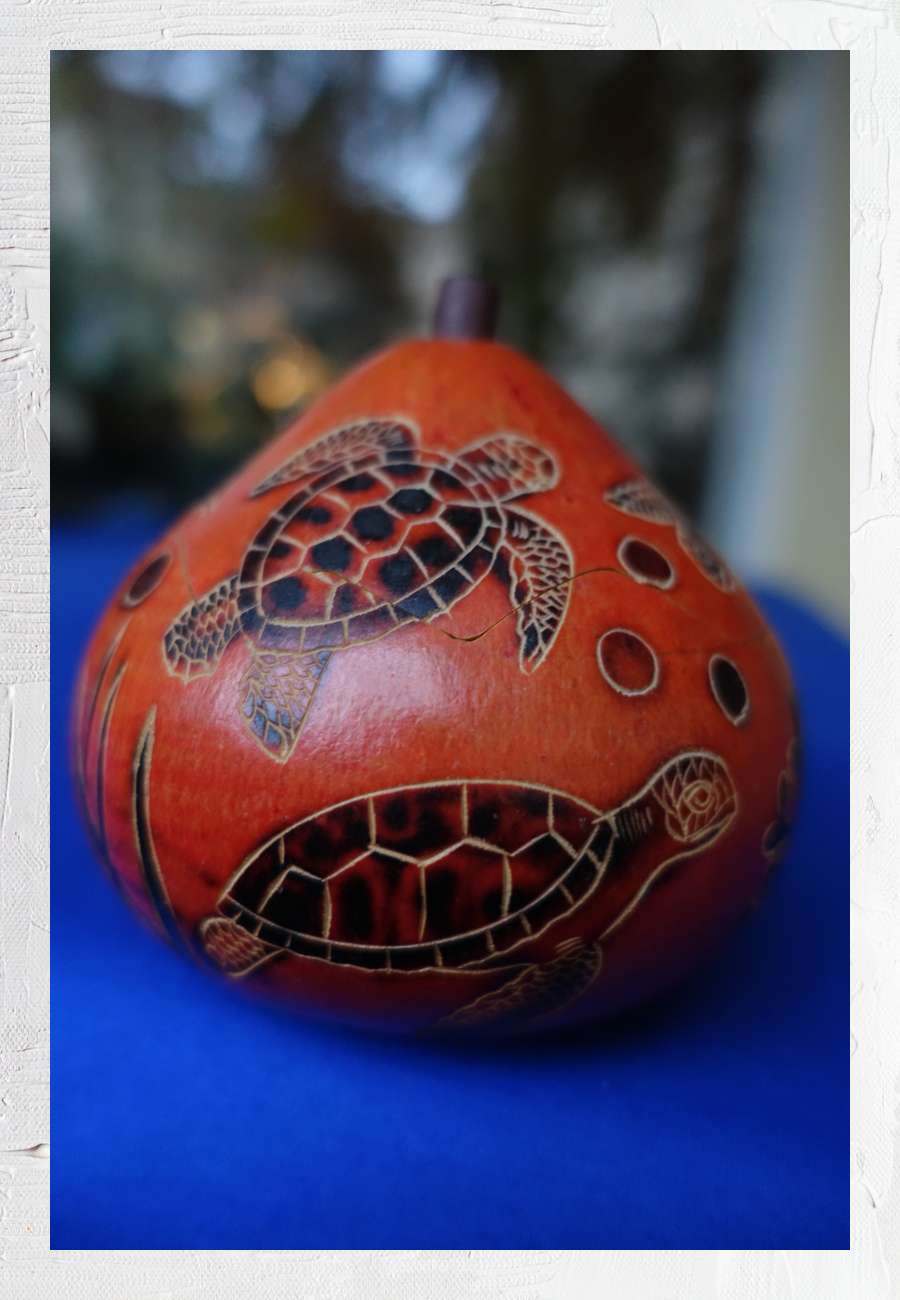 und Bemalung u.a. mit 4 Meeresschildkröten verziert, Durchmesser ca. 12 cm. Die Frucht dient auch als Trinkgefäß, Schale oder
