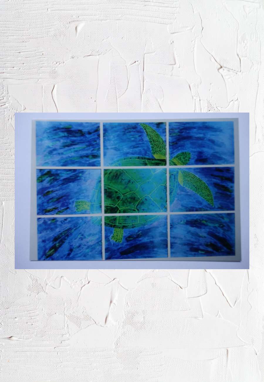Bild in Tadelakttechnik (dabei wird Farbe über Farbe gespachtelt, die jedoch außerordentlich dünn aufzutragen ist), Titel "Die Weisheit des Meeres", Unikat, Acrylfarben. Es besteht aus 9 Seiten je 50 x 70 cm, d.h. das ganze Werk misst 214 x 154 cm. Von der Idee und Qualität der Blätter ein "Eyechatcher". Der Künstler beschäftigt sich seit vielen Jahren mit Buchkunst und hat u.a. auch 2 illustrierte Schildkröten-