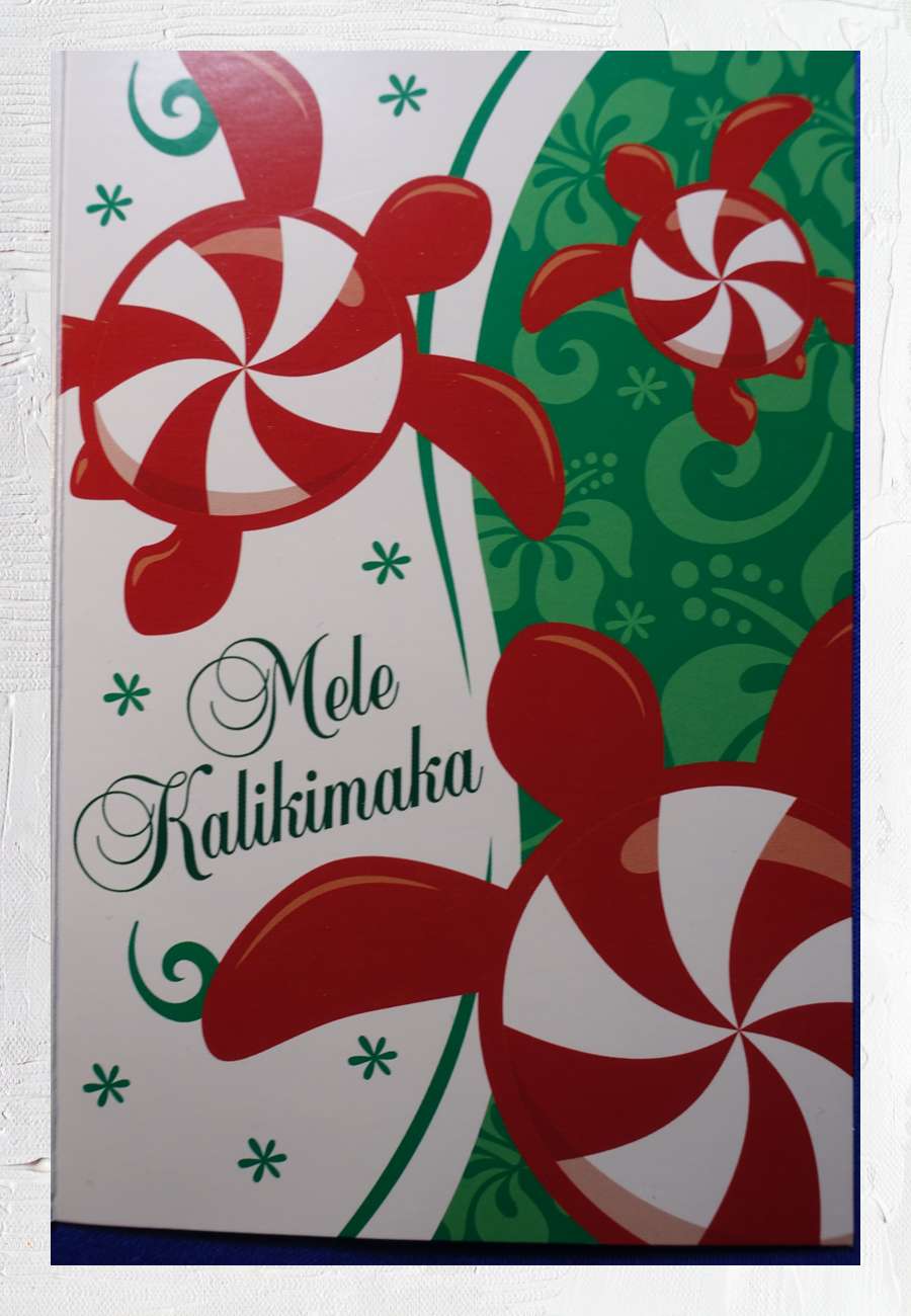 Weihnachtskarte, "Designed and illustrated in Hawaii", aber "Printed in China" .