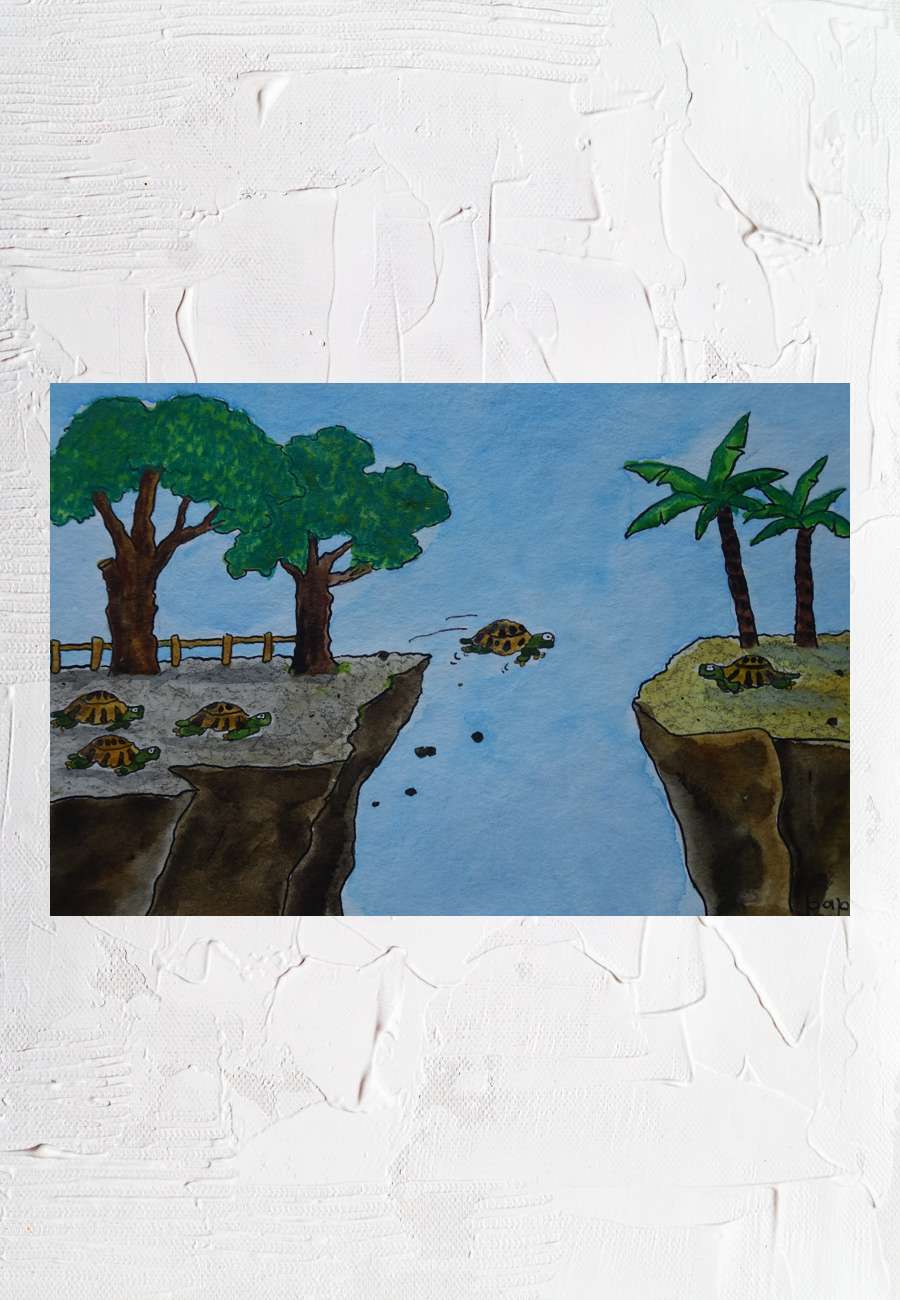 Auftragsarbeit an "papan" (Künstlername), Aquarell, Unikat, sign., Format 25 x 25 cm. Der Begleittext dazu: " Eine große Liebe läßt sich durch die Wirklichkeit nicht stören... ". Er zeichnet seit 1968 ( u.a. für die Süddeutsche Zeitung, Zeit, Stern) und hat viele Bücher gemacht, aber ohne Schildkröten-Motive. Inzwischen hat das Museum Wilhelm Busch - das Deutsche Museum für Karikatur und Zeichenkunst in Hannover - ca. 1.000 seiner Arbeiten erworben. Er ist übrigens Großneffe des letzten deutschen Reichskanzlers, der Hitler an die Macht brachte, hat jedoch mit seiner Familie gebrochen.