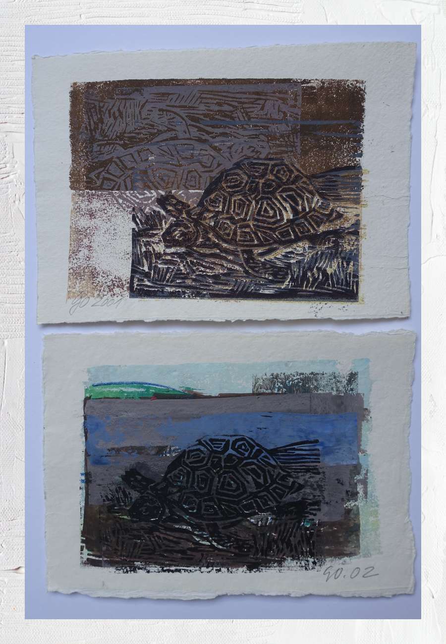2 Holzschnitte, teilweise übermalt, edition go, mit Einband und Fingerabdruck, datiert, sign., Format je DIN A 5.