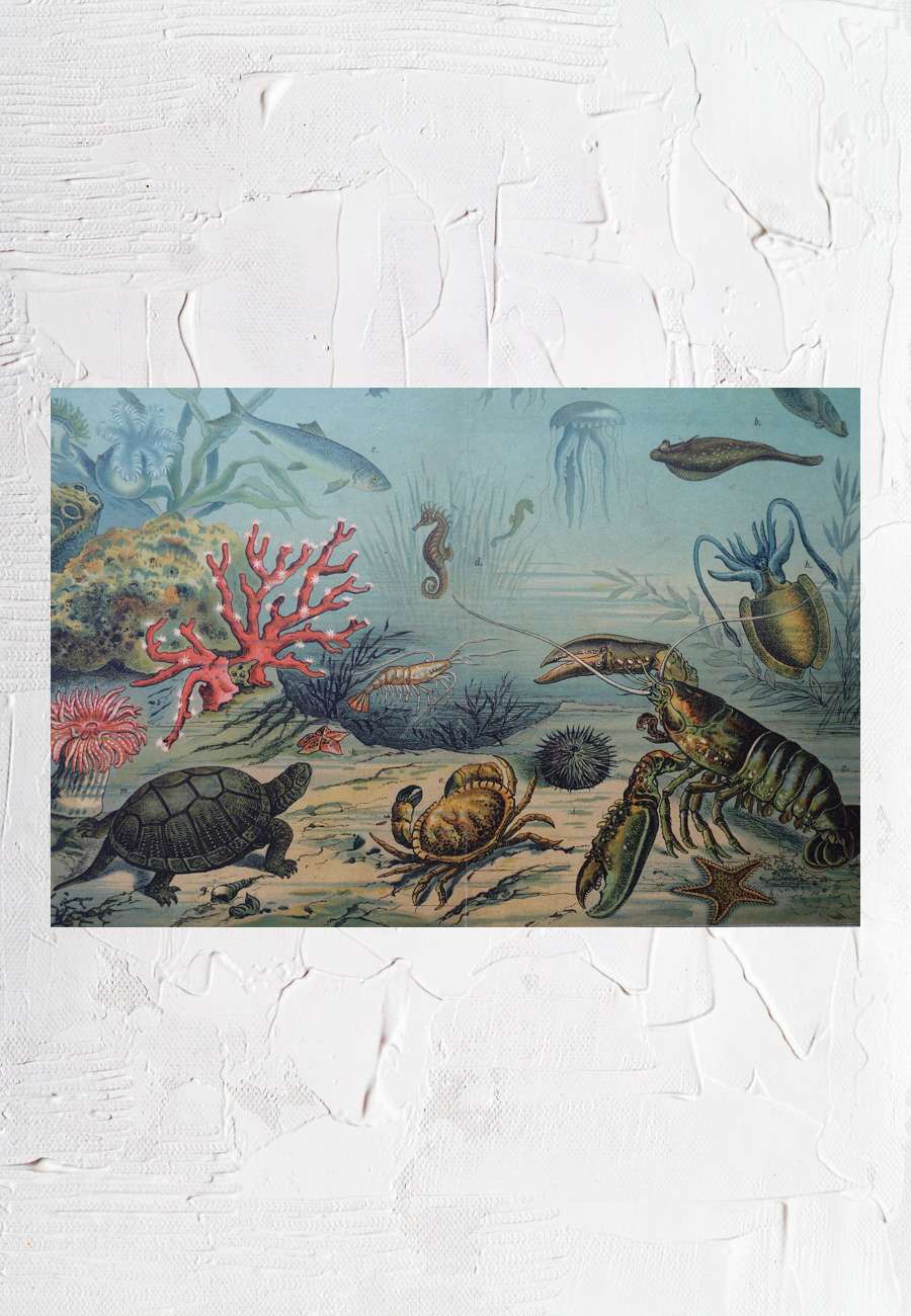 Bildtafel 10 zum Anschauungs-Unterricht, Titel "Das Leben im Meer", Format 38 x 31 cm. Die Darstellung der Meeresschildkröte entspricht optisch aber eher der