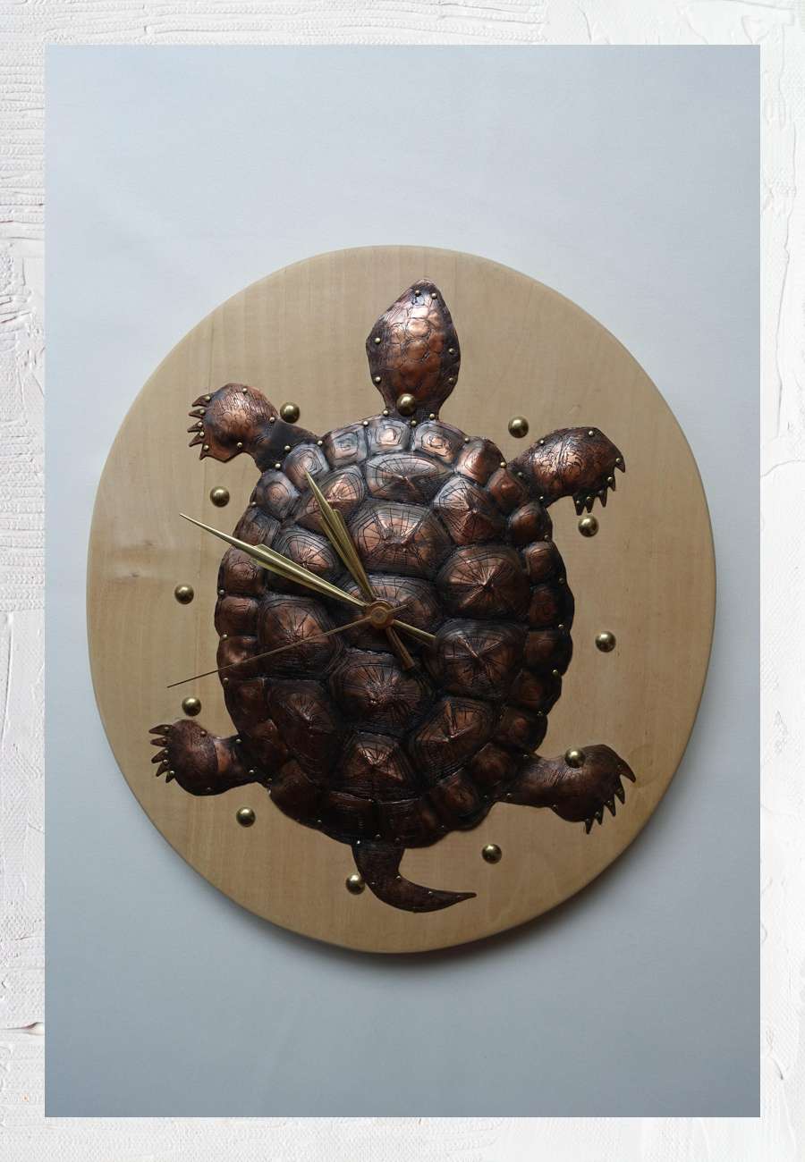 Batteriebetriebene Uhr, das Ziffernblatt ist aus aus Kupfer, handgetrieben und fein ziseliert, montiert auf eine ovale Platte aus massivem Holz (Durchmesser ca. 33 cm). Es ist ein Geschenk des Künstlers, mit dem ich seit gemeinsamen Besuchen der Sommerakademie Neuburg/Donau (2004 und 2005) befreundet bin.