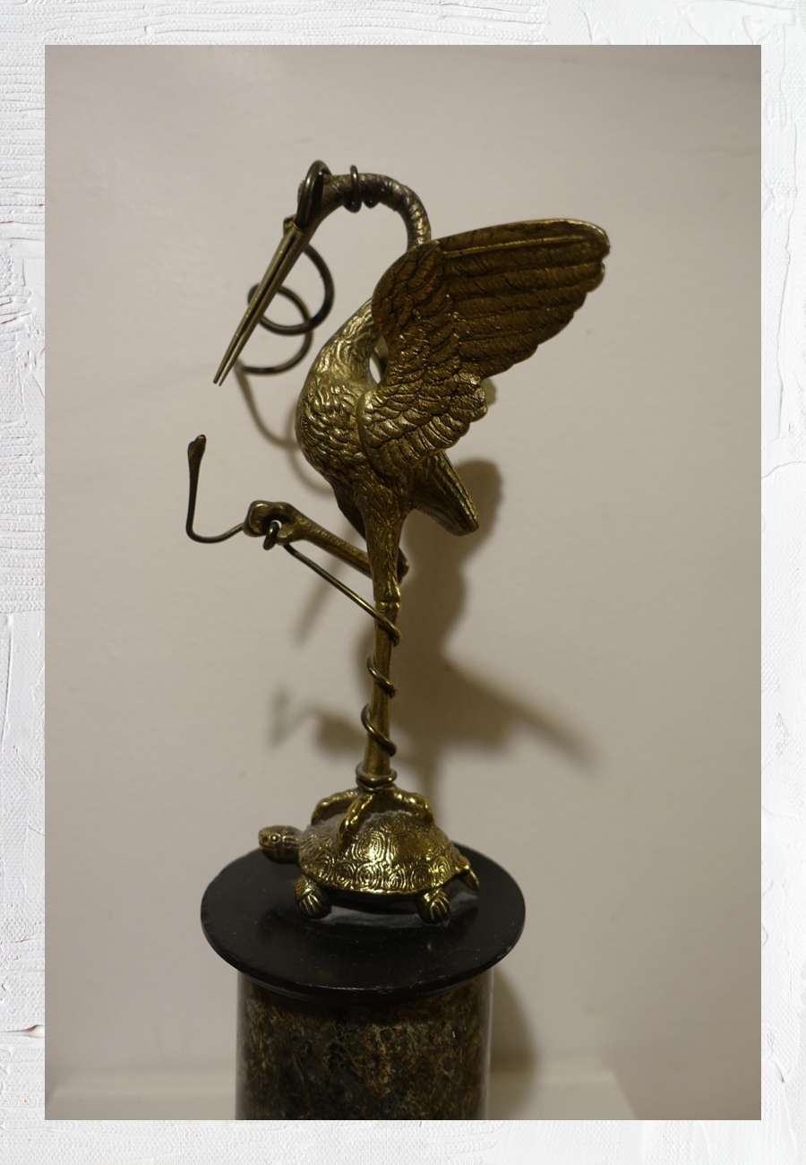 Messingskulptur auf einer kleinen Marmorsäule mit quadratischem Steinsockel. Auf der Schildkröte steht ein Kranich, der sich zweier Schlangen erwehrt,