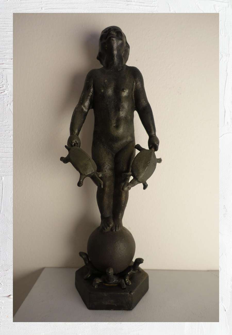 Massiver Eisenguß, originelles Design, ohne Signatur, ca. 30 cm hoch. Auf einem sechseckigem Sockel liegt eine Kugel, die von 4 Schildkröten getragen wird. Erstaunlich