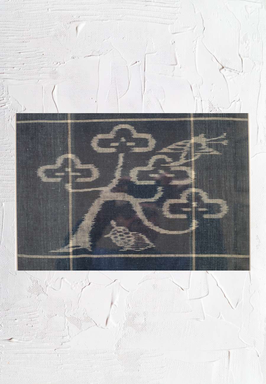 Kimono-Stoffmuster (Fragment), Ikat-Webarbeit, Baumwolle, mit Indigo gefärbt, Meiji-Zeit (um 1900), mit den typischen Motiven: Minogame, Kiefer und Reiher, Format mit Rahmen 40 x 50 cm. Ikat-Stoffe werden in Japan noch heute für hochwertige Kimonos genutzt.