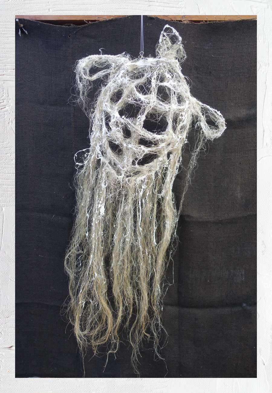 mich ihre Technik faszinierte, kam es zu dieser Auftragsarbeit aus Draht, Hanffasern und Gips. Projektbegleitend hatten wir gute Gespräche, z.B. zur japanischen Kultur, einschießlich der Bedeutung der Minogame und deren Algenschweif. Sie hat sich sehr intensiv mit der Thematik beschäftigt, eine Reihe von Skizzen gemacht und mit Entwürfen experimentiert (s. weitere Abbildungen). Das Objekt kommt durch den Kontrast auf schwarzem Leinen sehr gut zur Geltung. Das Foto habe ich deshalb schon bei der Übergabe in ihrem Atelier gemacht.