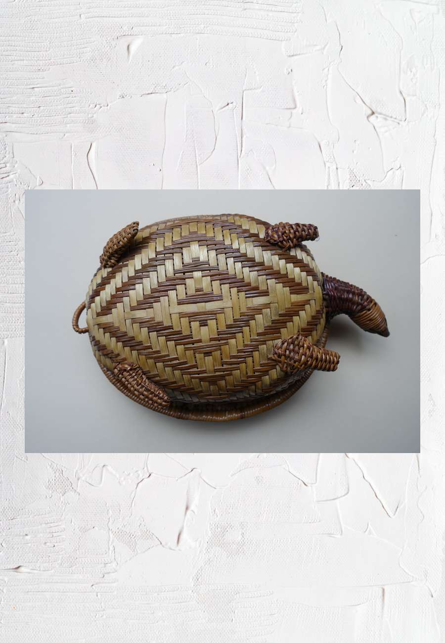 Korb mit Deckel, wegen der farbig schöneren Flechtarbeit ist hier die Unterseite zu sehen, Größe 31 cm.