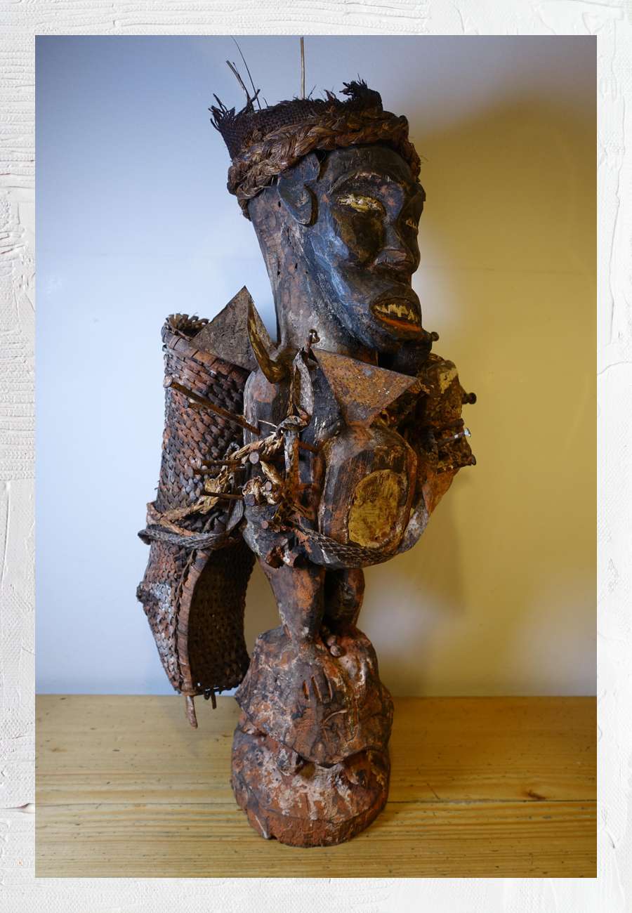 Objekt über Ethnographica Pfadenhauer aus der aufgelösten Sammlung eines belgischen Diplomaten. Dem Fetisch werden übernatürliche Kräfte zugeschrieben, er gilt als mit Macht aufgeladen und soll vor bösem Zauber, Krankheit und anderem Unheil schützen. Die auf dem Leib eingesetzte Spiegelkapsel (für die Aufbewahrung von Zaubermitteln) ist nicht erhalten, nur der Umriss ist wahrzunehmen. Nägel wurden auch zur Erfüllung von Wünschen eingeschlagen. Datierung um 1930, ca. 60 cm groß. Auf dem zusätzlichen Foto ist der Schildkrötensockel besser zu sehen.