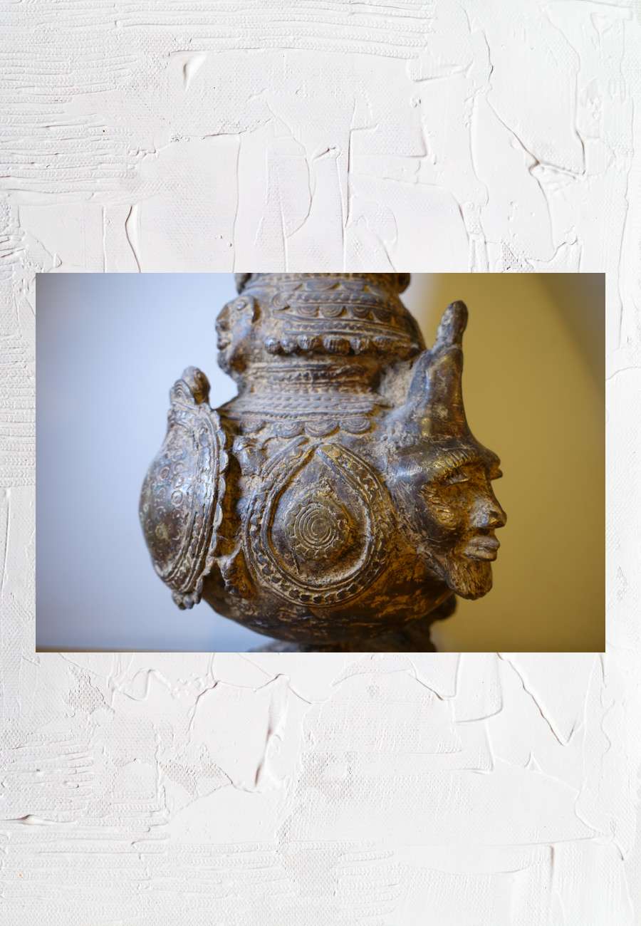 Ausschnitt zu dem Kultgefäß (Bronze) aus dem früheren Obervolta. Hier wird auf der linken Seite eine zusätzliche Schildkröte besser erkennbar. Gesicht und Schildkröte finden sich zudem noch symetrisch auf der Gegenseite des Kultobjekts.